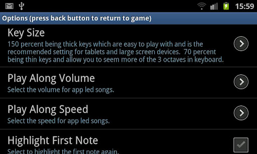 Legen Sie die Größe der Tasten auf dem Klavier. Je größer der Schlüssel, desto genauer, die richtigen Noten zu bekommen, desto kleiner sind die Tasten, die Sie alle 3 Oktaven auf dem Bildschirm sehen können.