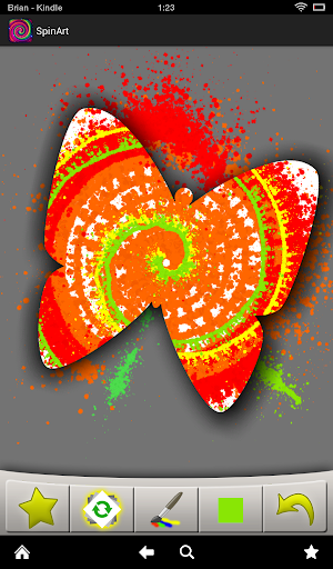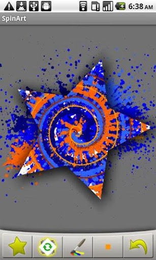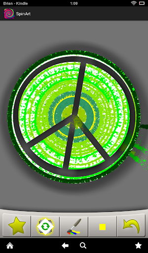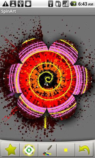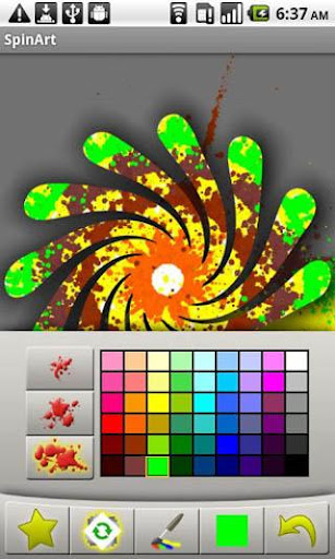 When in "Spin Mode" (the button with the green arrows on the left), swipe your fingers across the canvas to spin at varying speeds. Then switch back into paint mode (the paintbrush button), and choose from two brush sizes and a color from the palette, then use your finger to splat some paint and watch some amazing patterns emerge!