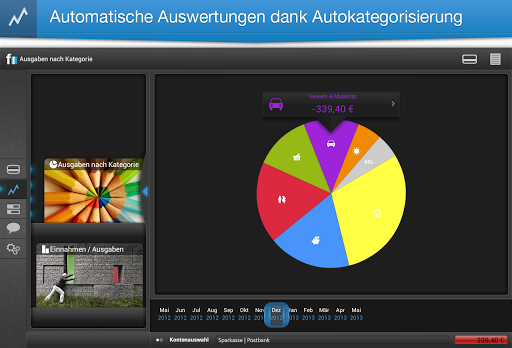 Bankkonten und viele Kreditkarten (Amazon, ADAC, u.v.a.m).Alles im Blick Dank intelligenter Autokategorisierung und automatischen Auswertungen.