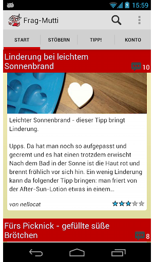 Mit unserer App hast du immer und überall unsere über 19.000 Haushaltstipps und Rezepte in der Tasche. Du kannst Tipps kommentieren, abspeichern, bewerten und weiterempfehlen. Und natürlich synchronisieren wir alles mit deinem Frag-Mutti-Account, so dass du auch am PC immer up-to-date bist.