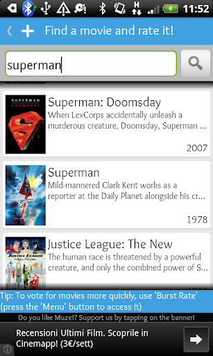 tags: muze for movies recommender recommendations theater cinema box office boxoffice new similar drama comedy horror sport film action adventure game animation cartoon crime foreign music mistery science fiction thriller war Netflix Rotten Tomatoes Movielens Flixster imdb Criticker Clerkdogs Nanocrowd Taste Kid Jinni